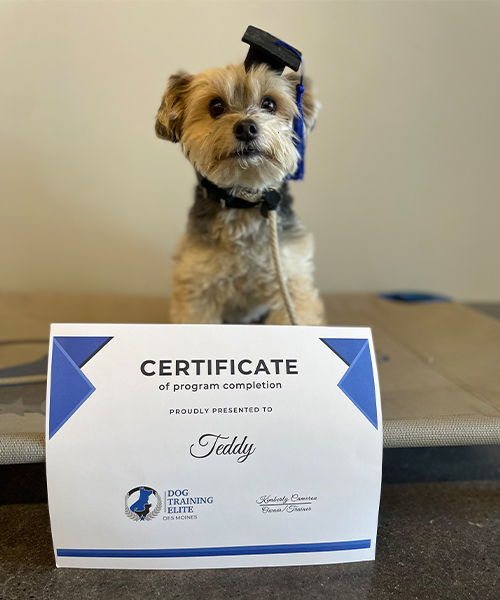 We have a 9.5 lb Morkie, who has been the stubbornest dog we have ever had, and we've had multiple miniature schnauzers over the years. We signed Teddy up for the Day Camp program where we dropped him off in the morning, one day a week, and picked him up in the evening. He did very well and graduated from Day Camp. Then we went on to the group classes, which we feel are very important for us to work with Teddy ourselves. I was pleased that within a few weeks, he was able to pass his Canine Good Citizenship test. He still has a few issues for us to work on, but with the help of Dog Training Elite Des Moines, I know it's just a matter of time and patience to get him to be the little dog with perfect behaviour. We are very happy to have had him involved with Dog Training Elite Des Moines.